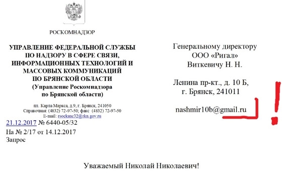 «Все, что нужно знать про компетентность чиновников Брянского Роскомнадзора, в одной картинке… По данным доклада Министерства образования РФ, умеют пользоваться компьютером только 16% школьных учителей. Какой процент пользователей среди чиновников и госслужащих, не разглашается. Брянский Роскомнадзор не смог отправить нам письмо обычной Почтой России, неверно указав адрес. С Интернетом тоже не получилось, хотя диктовали адрес электронной почты три раза подряд», – возмущается Виткевич, отмечая, что «эти люди пытаются командовать Интернетом».